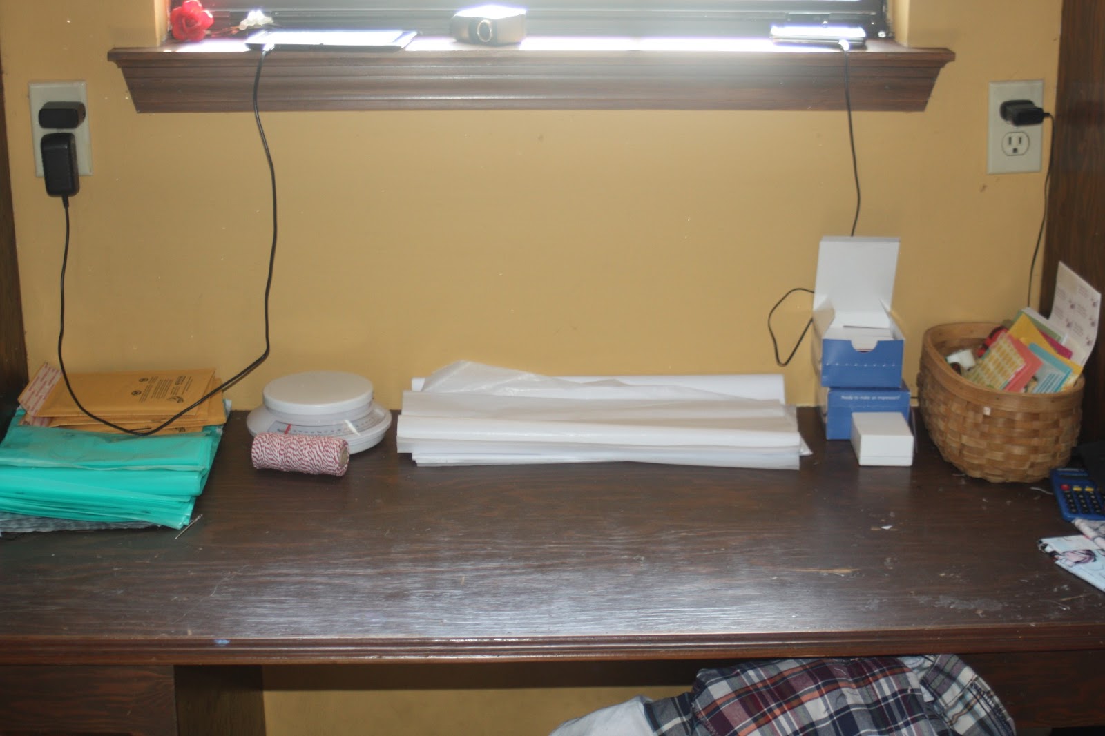 Alright, on to how I put my packages together. Please forgive the photos, as I'm NOT a professional photographer! Here's my packaging station. I keep everything I need here (unless my kids steal my pens...which usually happens!) I have poly mailers, tissue paper, business cards, my mini-moo cards that have my washing instructions on them, my kitchen scale for weighing my packages, a basket with all my notecards, tape, paper scissors, pens, Sharpies, and baker's twine. I also have some space for laying everything out.